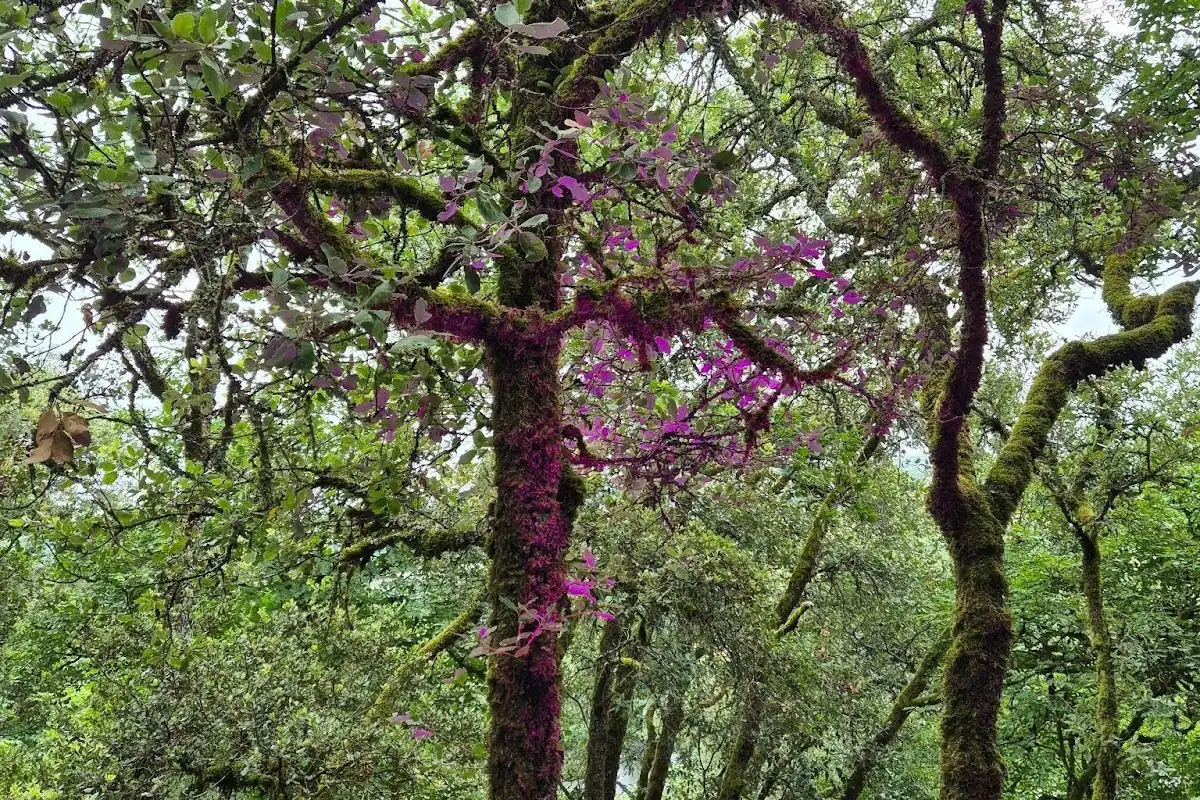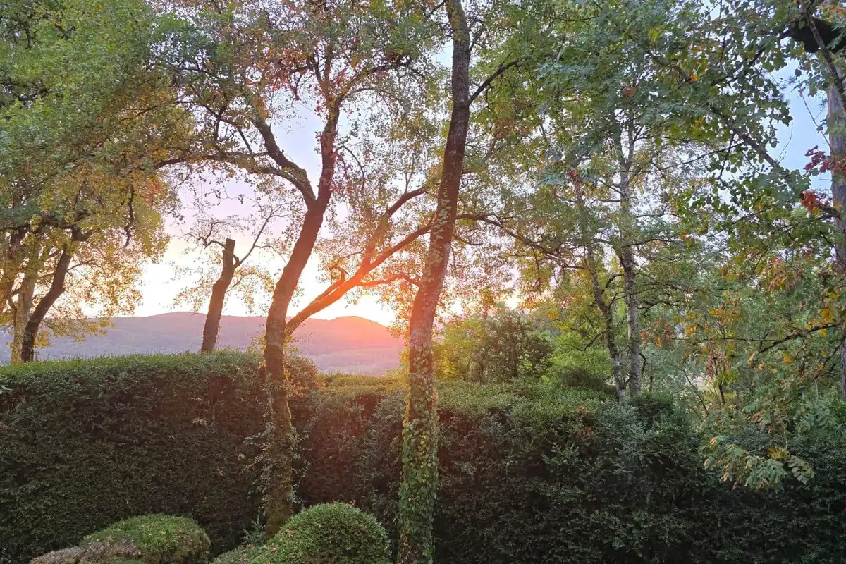 Lors de votre visite, vous pourrez admirer le coucher du soleil et les derniers rayons qui s'immiscent entre les feuillages, mettant en valeur la beauté de ce havre de paix.