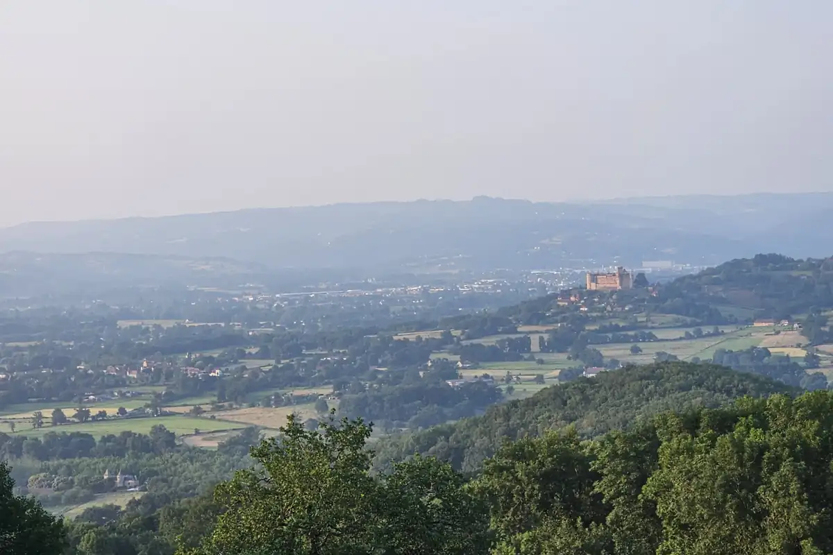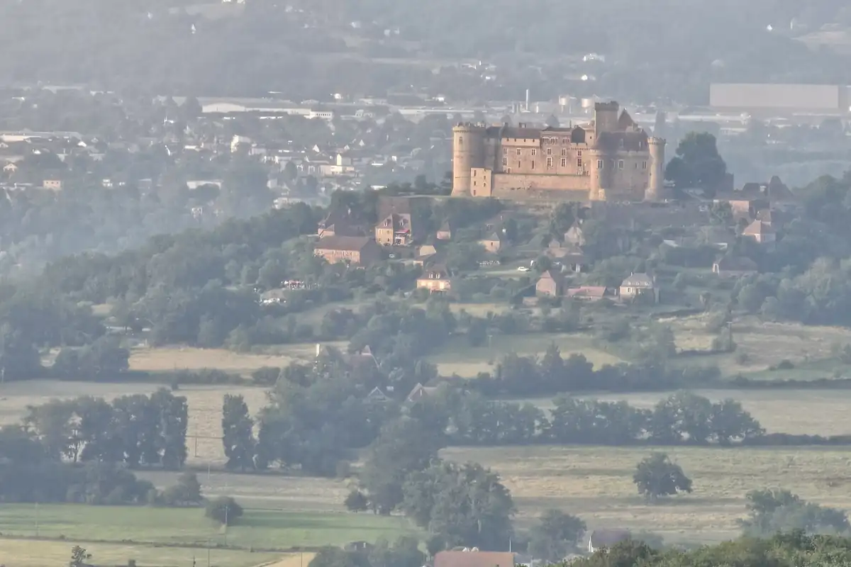 Commence par t'approcher du belvédère, à gauche de l'épicerie. De là, on a une vue incroyable sur la vallée en contrebas : des immenses prairies parsemées de petits villages et, au-delà, des collines verdoyantes qui se déploient gracieusement jusqu'à se fondre dans la brume avec la ligne d'horizon. Sur l'une d'entre elle, vers la droite du panorama, tu distingueras une impressionnante forteresse médiévale dont les pierres arborent une jolie nuance de rose : le château de Castelnau-Bretenoux. Derrière, plus à droite encore, se dresse une autre forteresse médiévale dont les deux tours s'élancent gracieusement vers le ciel : le château des Tours-Saint-Laurent.