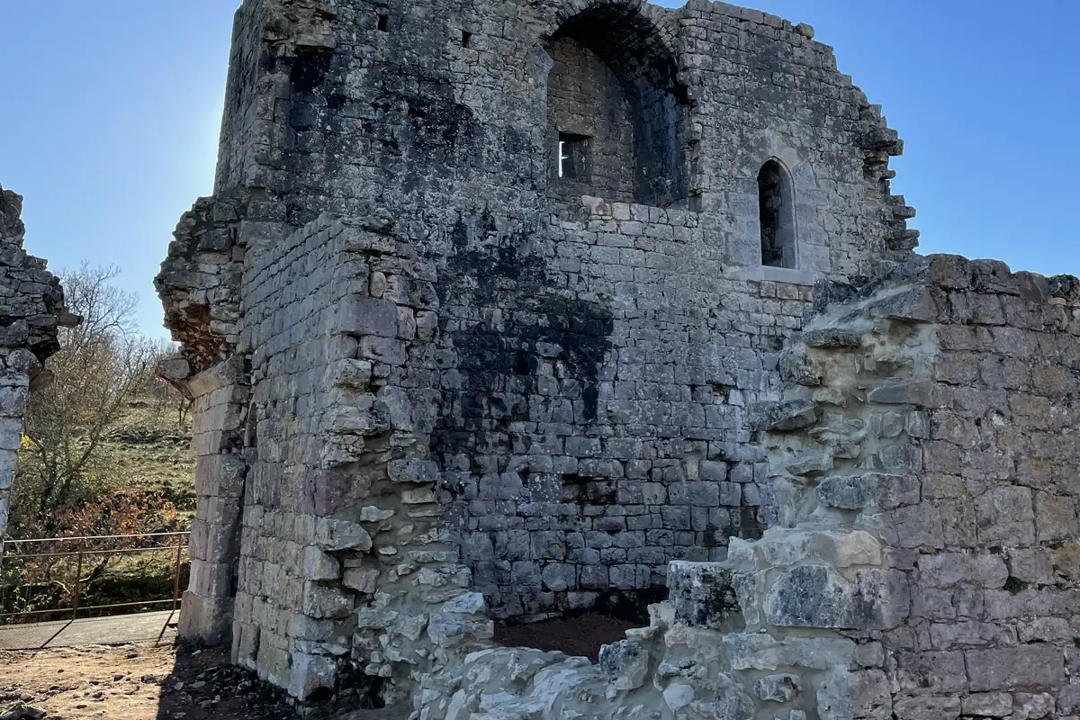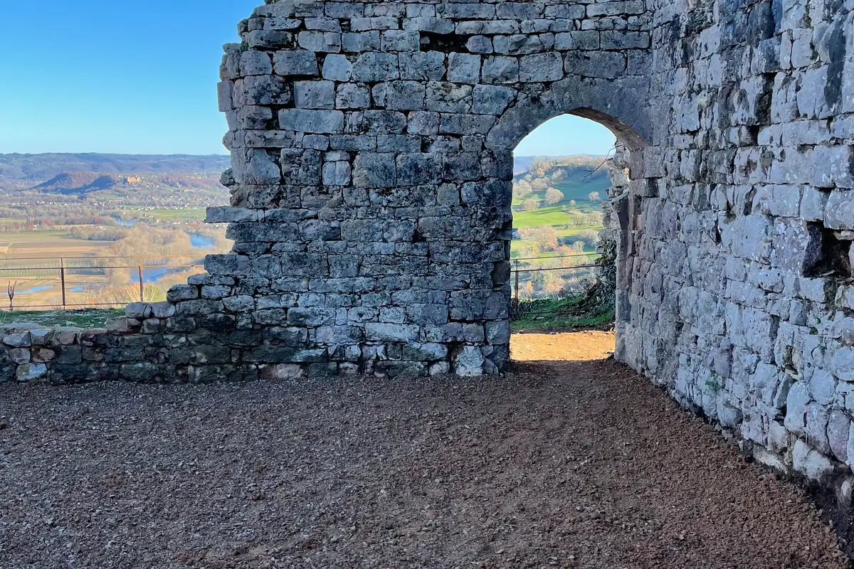 Les anciens disent que, depuis les ruines, on peut voir « trois châteaux et sept clochers ». Pour ce qui est des châteaux, tu distingueras nettement celui de Castelnau-Bretenoux avec ses massives tours roses, que tu as déjà aperçues en descendant la route de Gintrac. Plus loin, à droite, se dressent aussi les Tours-Saint-Laurent, autre forteresse médiévale. Et si le temps est clair, tu devrais pouvoir voir en contrebas de cette dernière le château de Montal, qui, lui, date de la Renaissance.