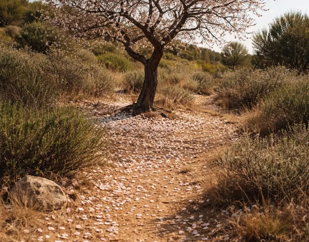 La garrigue s'ouvre, puis se resserre. Les couleurs changent à chaque pas. Le blanc du calcaire, le vert argenté des arbustes, le rose pâle de quelques pétales d'amandier déjà tombés au sol — l'arbre a fleuri plus tôt, fin d'hiver, mais il reste cette trace délicate, presque nostalgique. Je m'accroupis. Je touche la pierre encore fraîche. Le vent soulève les herbes. Tout est matière. Tout est présence.